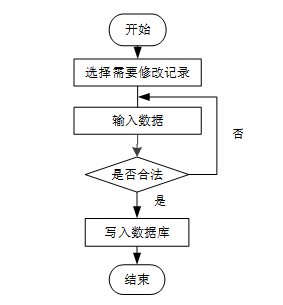 用户首先选择需要修改的记录,输入修改后的数据,系统判断输入数据是否合法。若数据不合法,提示重新输入;若数据合法,则将修改后的数据写入数据库,完成操作后流程结束。修改信息流程图如图4-4所示。