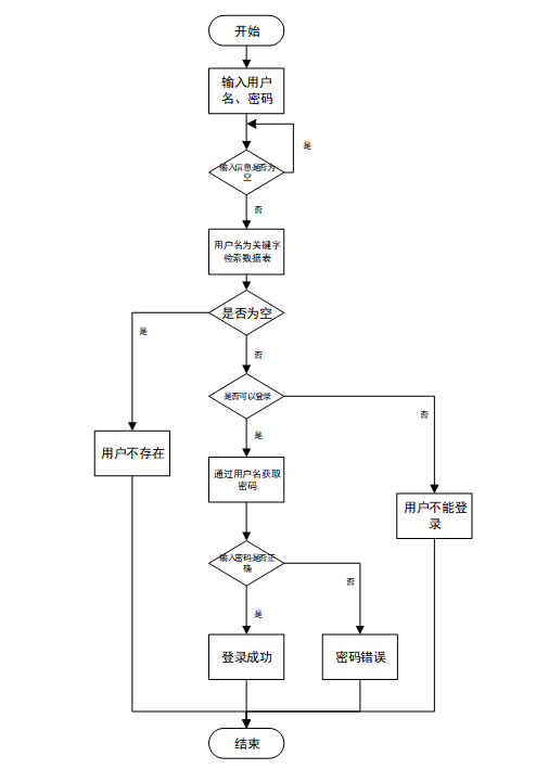 用户输入用户名和密码后,系统先检查输入是否为空,再验证用户名是否存在,若存在则通过用户名获取密码并校验。若密码正确则登录成功,否则提示密码错误。若用户名不存在或无法登录,提示用户操作无效。如图4-2所示。