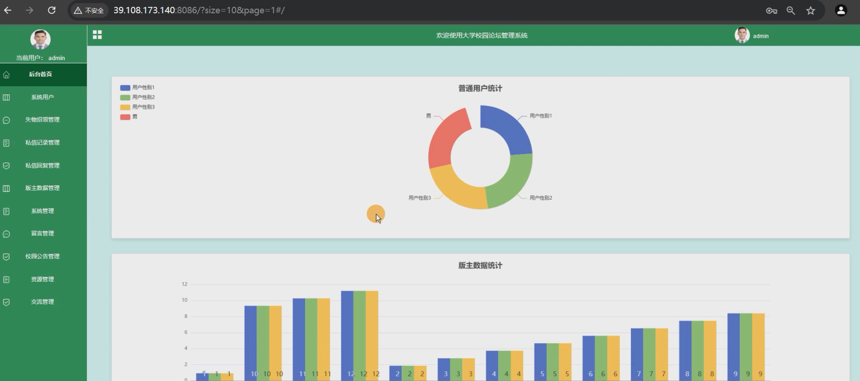 - 后台首页:展示系统的整体运行情况,提供各类数据概览(如用户数量、帖子数量、活跃度等)。