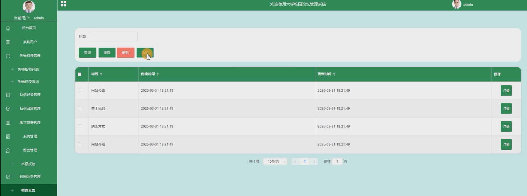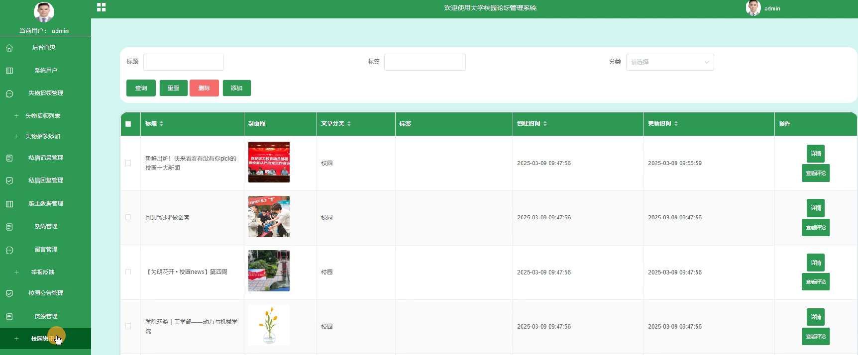 - 校园公告管理:管理员可以发布、修改、删除校园公告,确保重要通知及时更新。