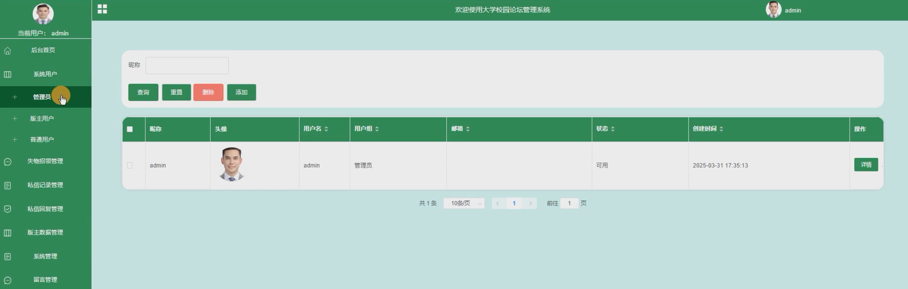 - 系统用户管理:管理员可以管理平台内所有用户,包括普通用户、版主用户和管理员,进行用户的新增、删除、权限修改等操作。