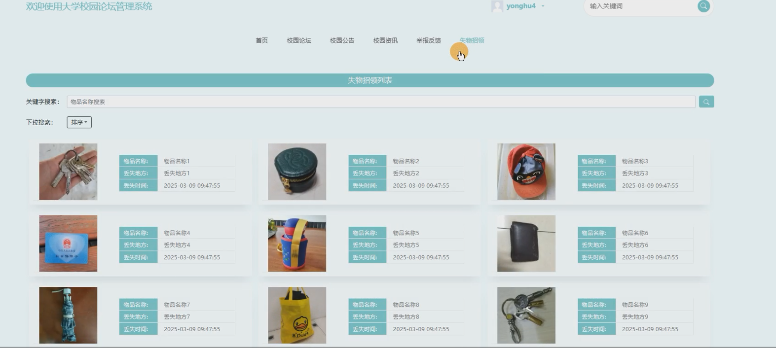 普通用户点击“失物招领”,可查看失物招领列表,还可以通过关键词搜索。失物招领界面如下图所示。