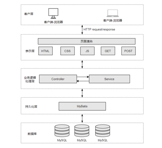 B/S架构通常采用Web技术进行实现,包括HTML、CSS和JavaScript等。用户在浏览器中发起请求,服务器响应并返回数据。数据传输通常通过HTTP或HTTPS协议进行,B/S架构的灵活性使其适用于在线购物、信息管理系统和社交网络等各类应用场景[4]。由于其易于扩展性,B/S架构可以方便地支持大规模用户访问,适应不断变化的业务需求。