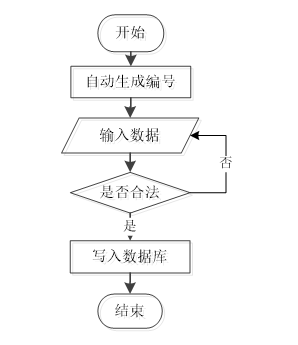 用户成功登入系统后就能够实现增加数据的操作,增加数据的编号是特定的,系统生成,用户不能随意填写,除了编号以外,其他增加信息用户自己填写,填写后的信息经过系统验证,验证合法通过就显示增加数据成功了,相反的话,就没有增加成功,数据新增数流程图如下图2-3所示。