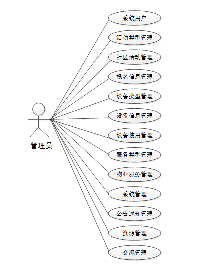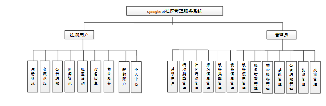 按照社区管理服务服务管理系统的角色,主要划分为志愿用户、社区居民用户和管理员三大功能模块,具体内容如下。