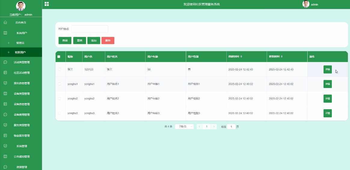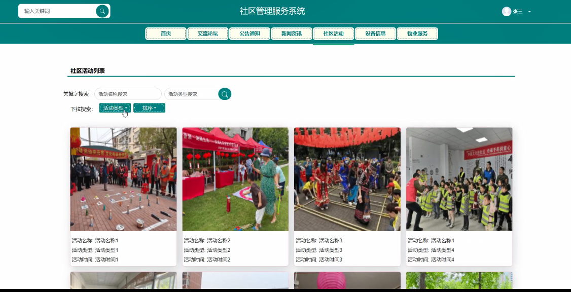 (3)社区活动管理:管理员可以查看社区活动列表,并对社区活动信息进行删除、添加操作。