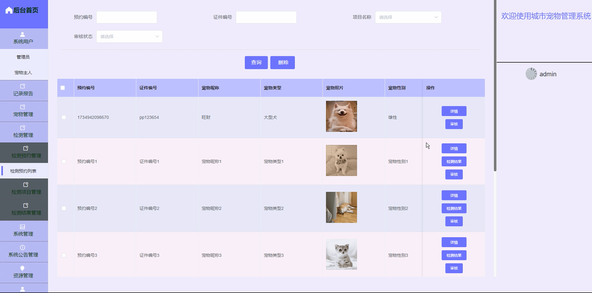 检测管理:管理员可以管理宠物的健康检测预约,安排检测时间和地点,确保检测服务的高效性。