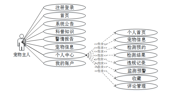 宠物主人具备登录注册、首页、系统公告、科普知识、警情报告、宠物信息、我的账户、个人中心(个人首页、宠物信息、检测预约、检测结果、违规记录、监测预警、收藏、评论管理)等需求用例,详细用例图如图3-1所示。