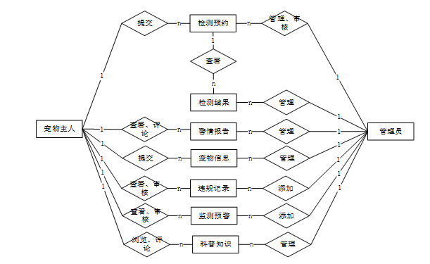 基于互联网的城市宠物管理系统用例分析主要从宠物主人、管理员这些实体展开描述。