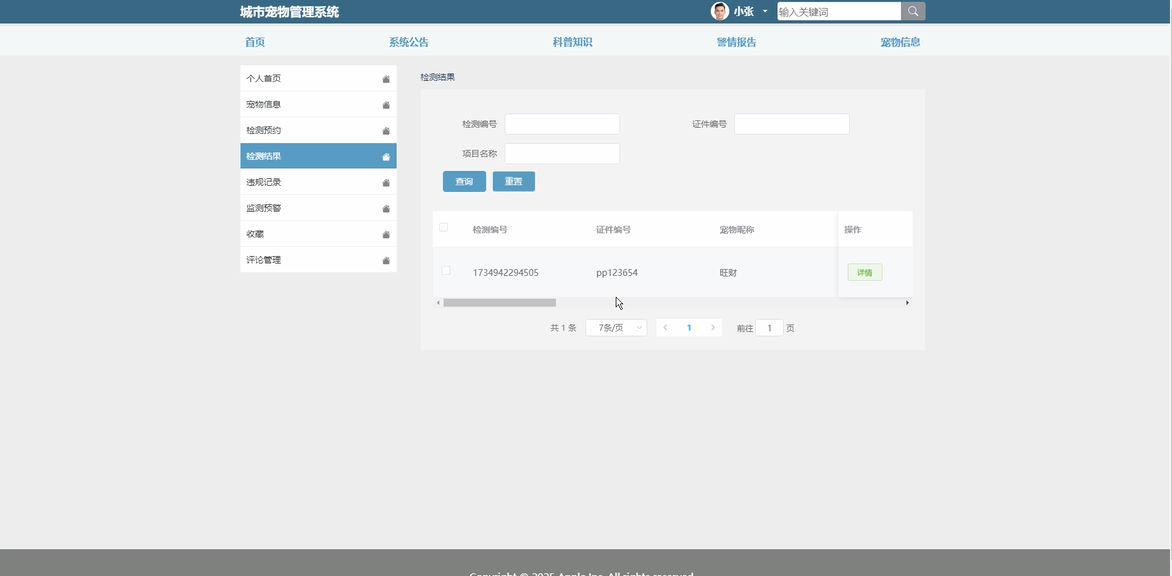 检测结果:查看宠物的健康检测结果,便于跟踪健康状况。