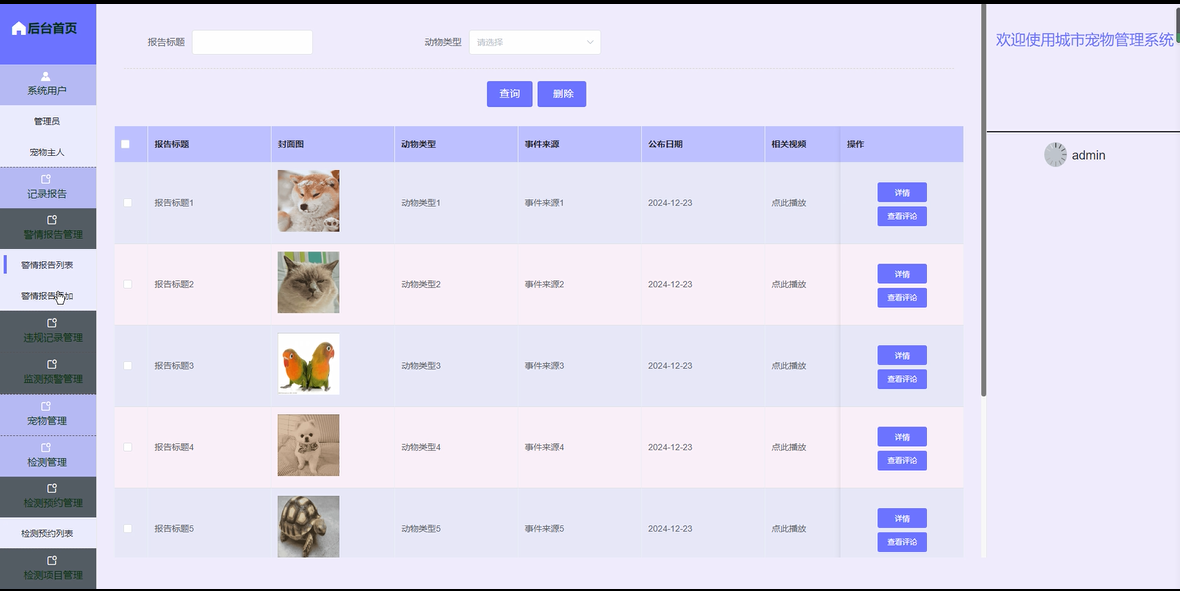 后台首页:管理员登录后进入后台首页,可以查看多个统计图,包括警情报告统计图、宠物信息统计图、检测预约统计图、违规记录统计图和检测预警统计图。这些统计图表直观展示了系统的运营状况,帮助管理员进行决策。