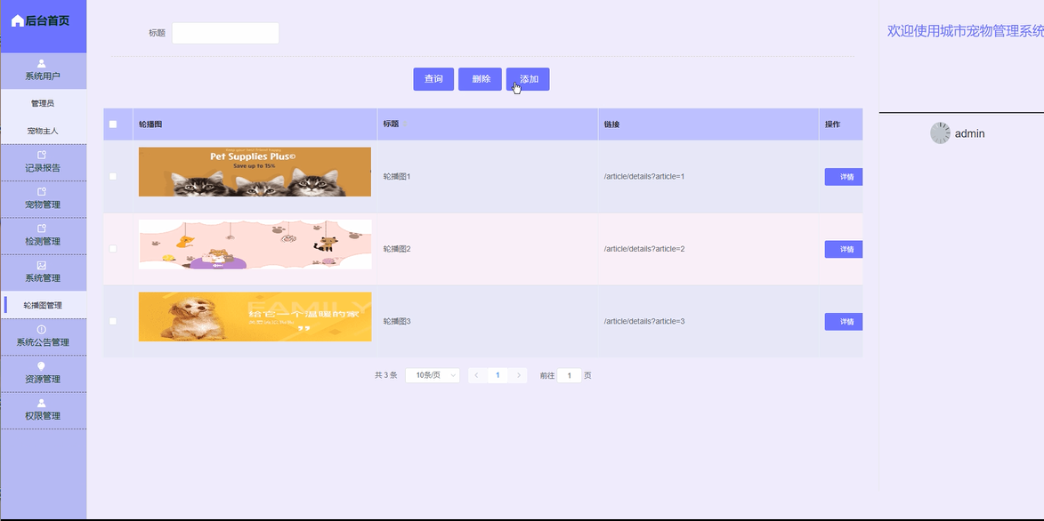 宠物管理:管理员可以对宠物进行全面管理,包括: