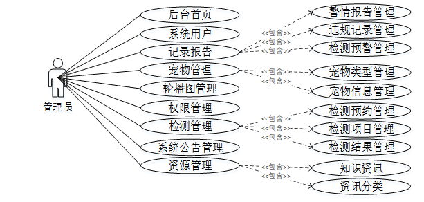 管理员具备后台首页、系统用户、记录报告(警情报告管理、违规记录管理、检测预警管理)、宠物管理(宠物类型管理、宠物信息管理)、检测管理、系统管理(轮播图管理)、系统公告管理、资源管理(科普知识、知识分类)、权限管理等需求用例。详细用例图如图3-2所示。