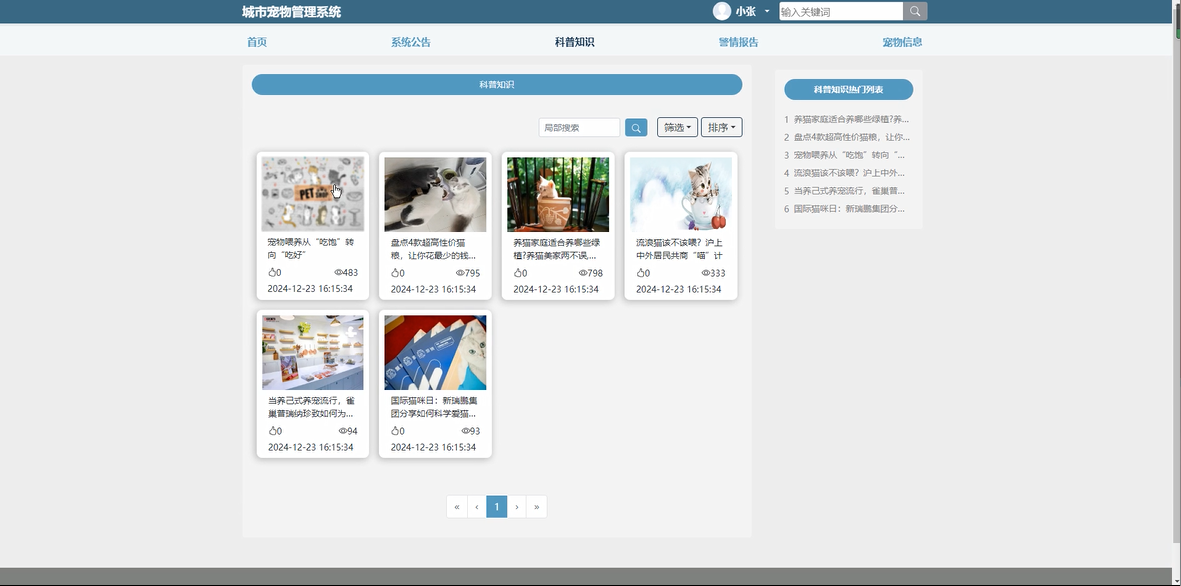 科普知识:系统提供宠物相关的科普知识,帮助宠物主人了解宠物的养护、健康管理和行为训练等重要信息,提升养宠经验。