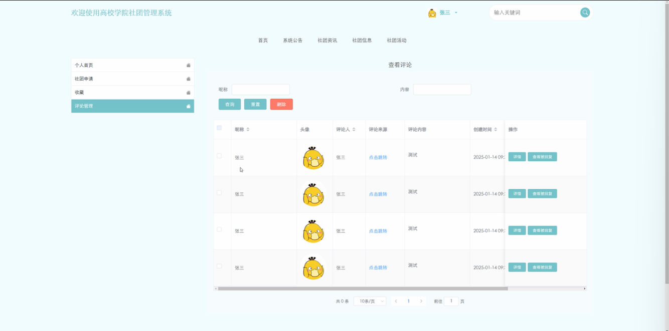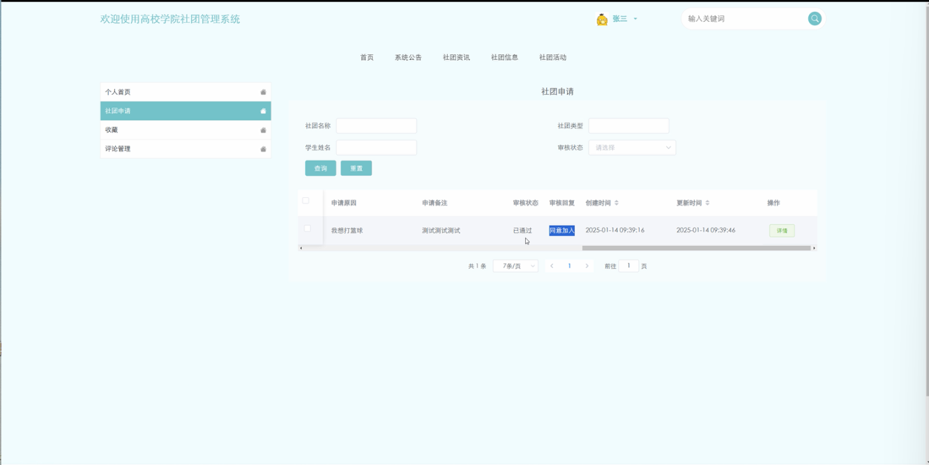 点击系统左上角的“个人中心”菜单按钮,用户可以在个人中心管理社团申请、收藏、评论管理等。用户可以查看自己的社团申请记录和审核状态、还可以查看和管理收藏的内容,查看自己的评论记录和被回复内容。社团申请页面如图5-8所示。评论管理页面如图5-9所示。