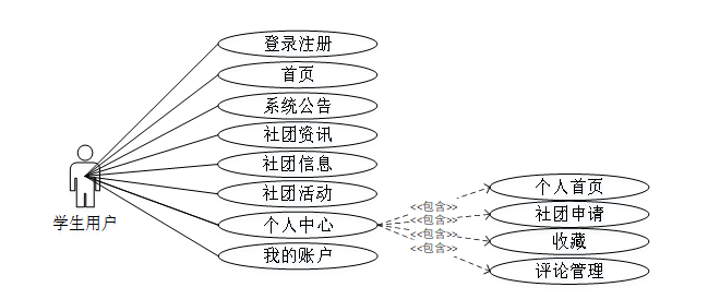 学生用户具备登录注册、首页、系统公告、社团资讯、社团信息、社团活动、我的账户、个人中心(个人首页、社团申请、收藏、评论管理)等需求用例,详细用例图如图3-1所示。