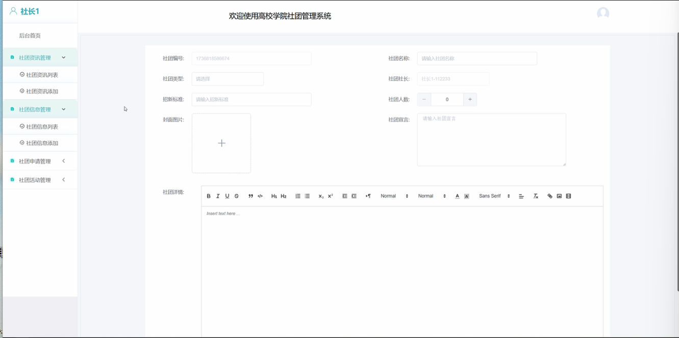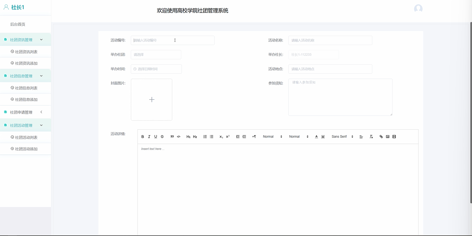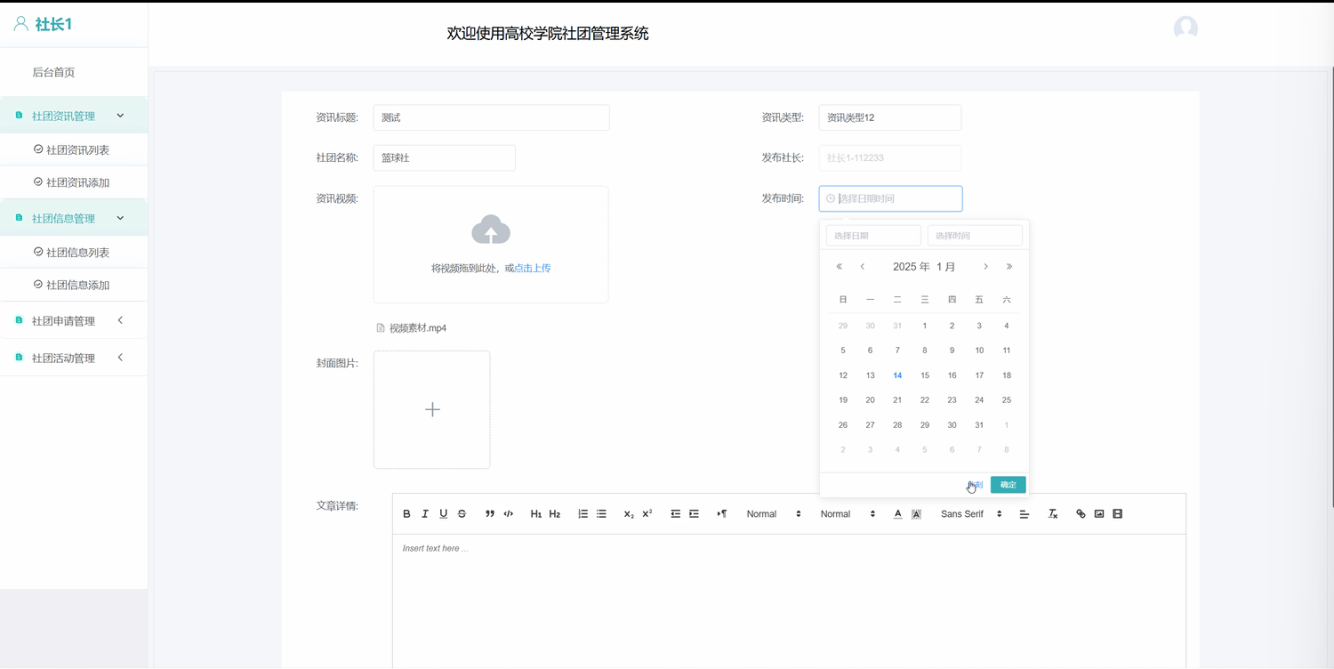 社团资讯管理:社长可以在后台发布社团资讯,包括社团的最新活动、重要通知等内容,供学生用户查看。社长可以编辑、修改资讯内容,并发布到平台上。