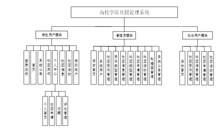 本系统通过提供学生用户登录注册、社团资讯、活动管理、个人中心等功能,帮助学生便捷地了解社团信息、参与活动并管理个人账户;社长用户可以在后台进行社团资讯发布、社团信息更新、社团活动管理和社团申请审核等操作,有效提升社团的管理效率;管理员则负责系统用户管理、社团资讯审核、活动管理等重要功能,确保系统的规范性和稳定性。