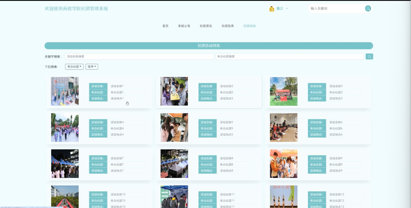 社团活动:学生可以查看社团的各类活动,包括即将举行的活动、过去的活动记录等。每个活动可以展示活动详情、报名信息及活动反馈,便于学生参与和了解活动的具体安排。