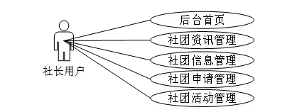 社长用户具备后台首页、社团资讯管理、社团信息管理、社团申请管理、社团活动管理等需求用例。详细用例图如图3-3所示。