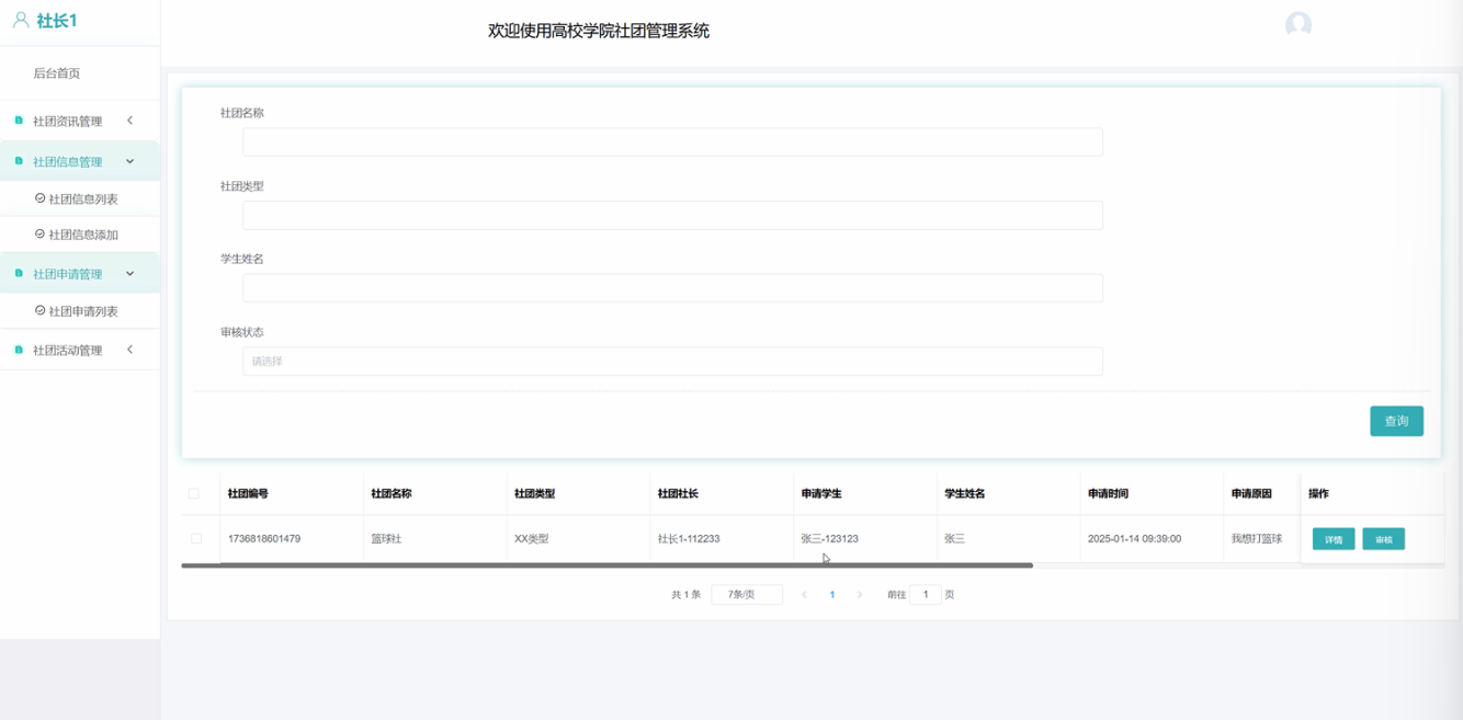 社团申请管理:社长负责审核学生提交的社团加入申请,查看学生的个人信息、申请理由等,决定是否通过学生的入社申请。社长可以根据社团需求和成员情况进行审批。