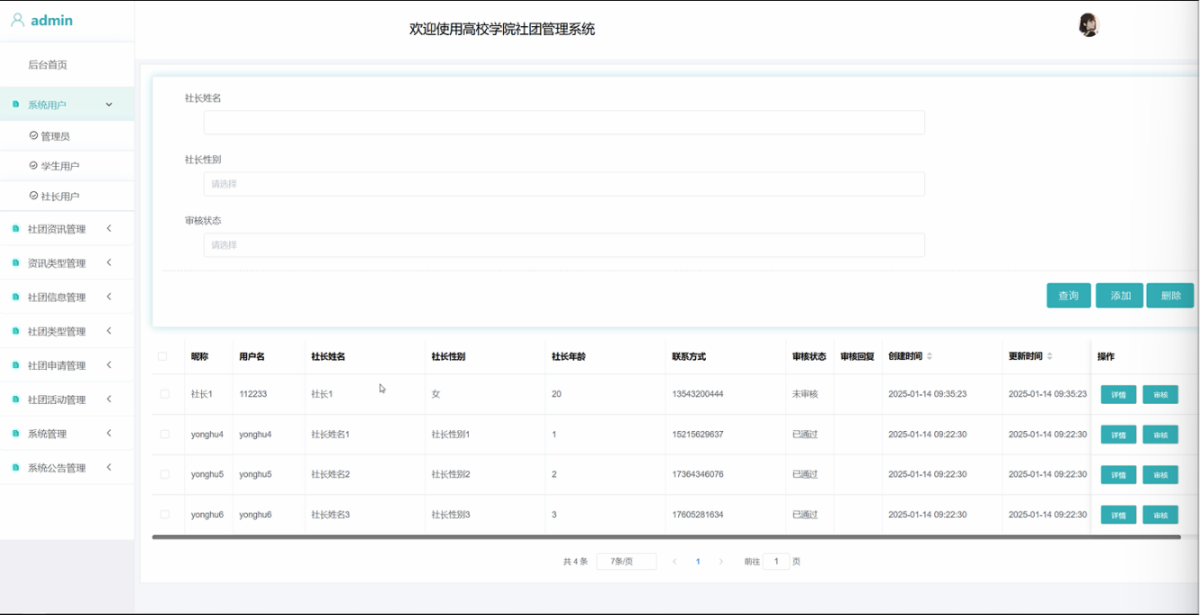 高校学院社团管理系统中的管理人员是可以对注册的学生用户和社长用户进行管理的,包括对用户信息进行增删改查等操作,也可以对管理员进行管控,社团用户的账号需由管理员进行审核。界面如下图5-11所示。
