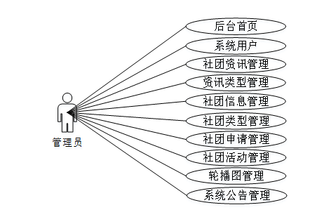 管理员具备后台首页、系统用户、社团资讯管理、资讯类型管理、社团信息管理、社团类型管理、社团申请管理、社团活动管理、轮播图管理、系统公告管理等需求用例。详细用例图如图3-2所示。