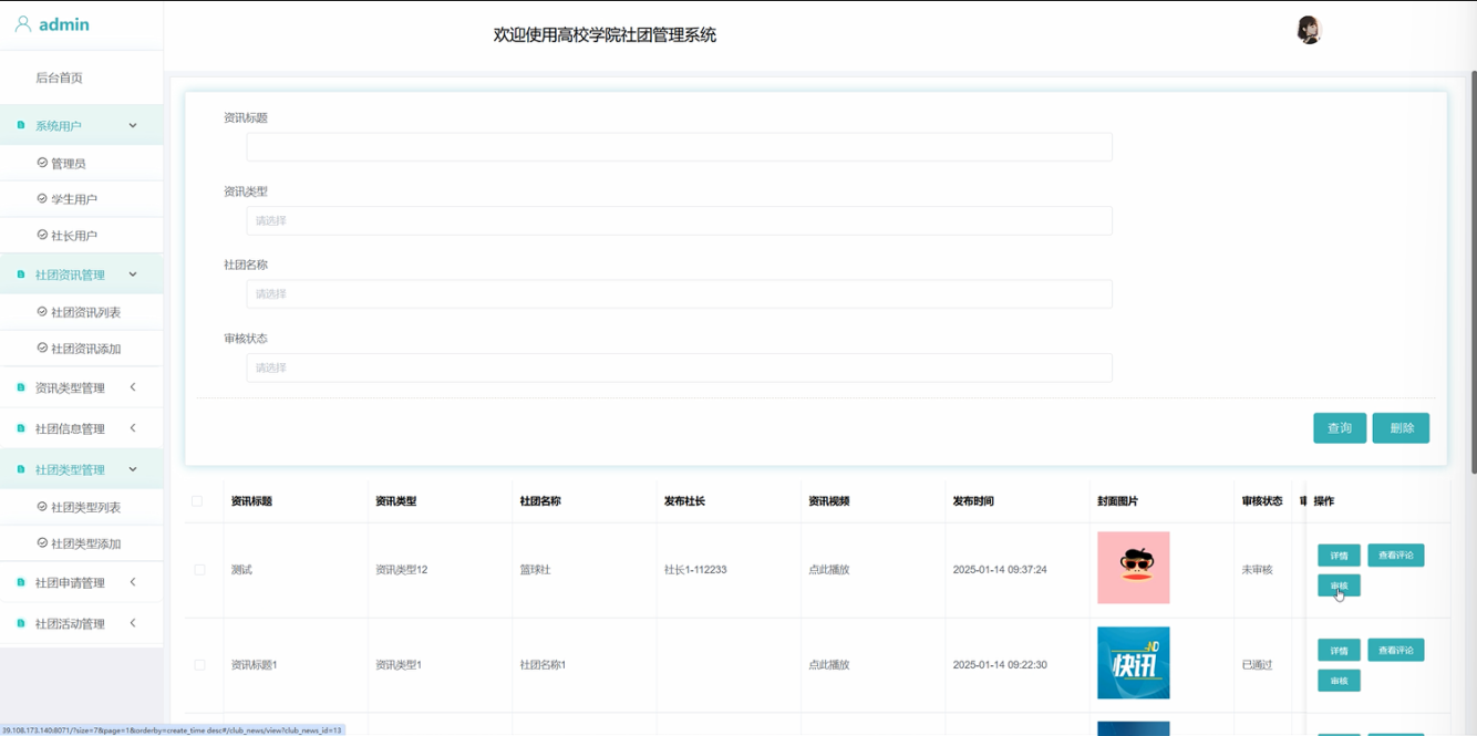 管理员点击“社团资讯管理”这一菜单会显示社团资讯列表和社团资讯添加两个子菜单,点击“社团资讯列表”可以查看和审核所有的社团资讯信息和用户评论,还可以进行查询、删除等操作。点击“社团资讯添加”,管理员也可以添加新的社团资讯信息。界面如下图所示。