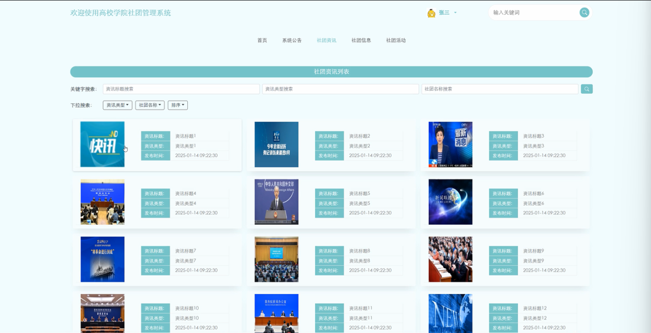 资讯类型管理:管理员负责添加社团资讯的类型,如活动资讯、通知公告、社团新闻等,并对已发布的资讯进行分类管理,便于用户更快捷地查找相关信息。