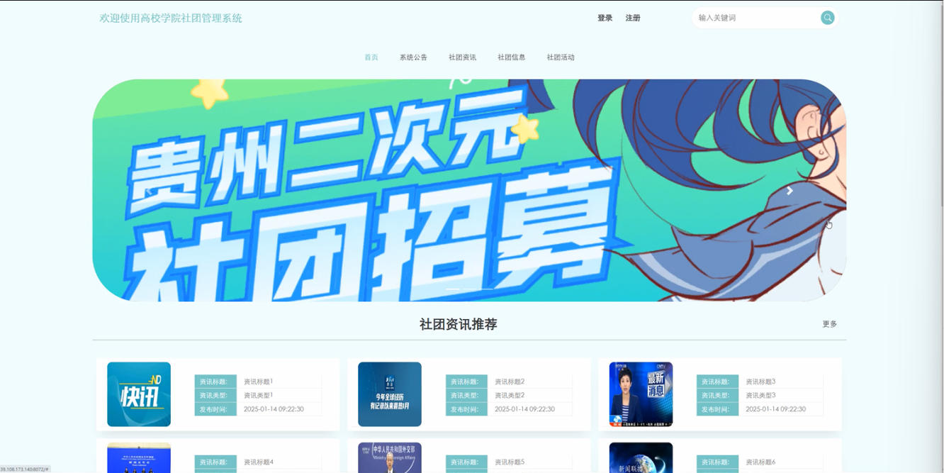 首页:学生用户登录后,系统展示个性化的首页,首页内容包括最新的社团资讯、推荐社团活动、以及热门社团等。首页设计应简洁明了,便于学生快速找到感兴趣的内容。