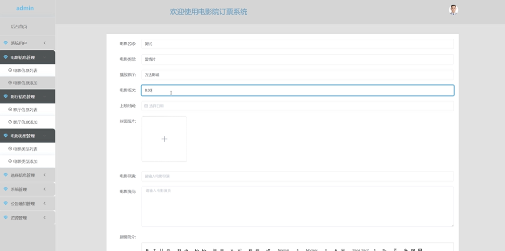 电影院管理员则可通过系统享受到全面的后台管理便利。他们能高效地管理电影信息、影厅座位布局及订单数据,同时实时监控系统状态,确保票务管理的精确与高效。系统还支持公告发布与资源上传功能,助力电影院的信息更新与活动推广。