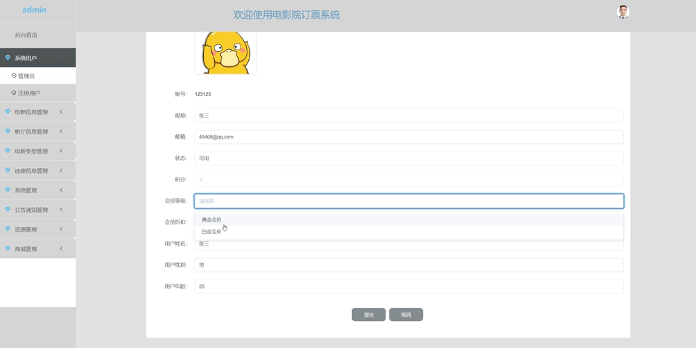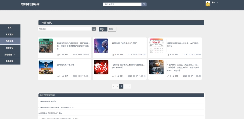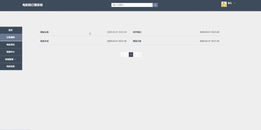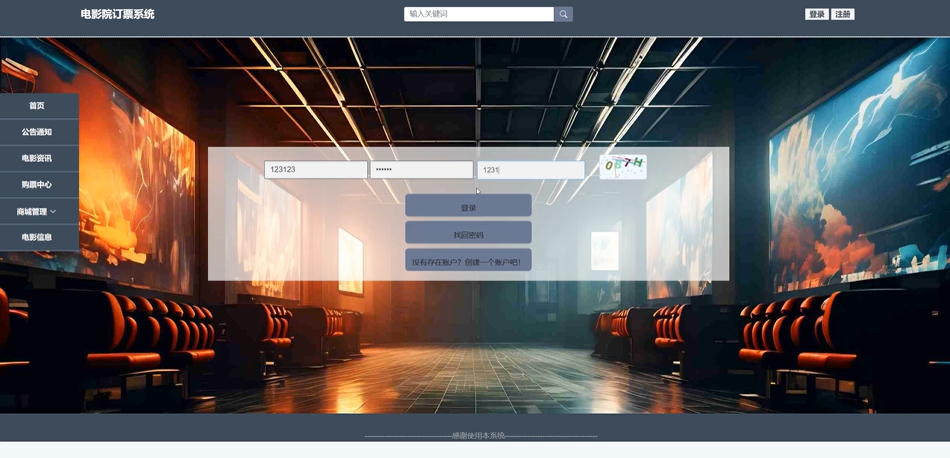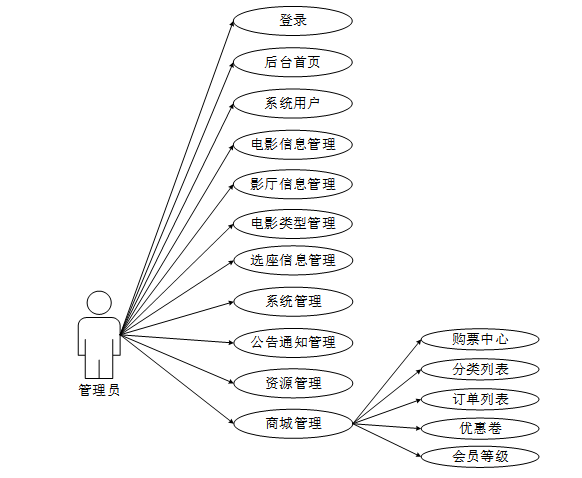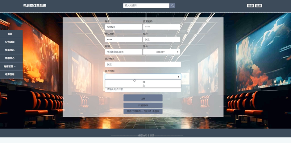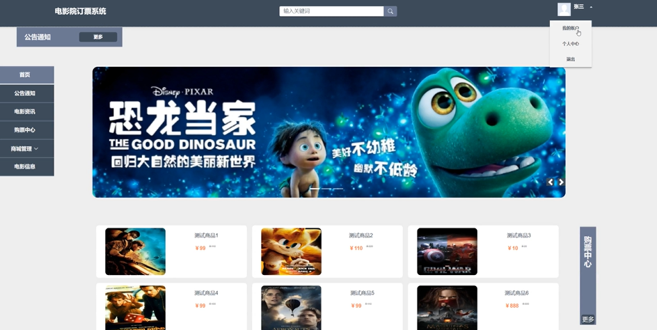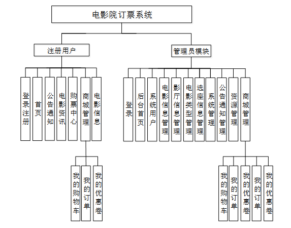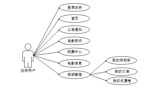 注册用户包含登录注册、首页、公告通知、电影资讯、购票中心、商城管理(我的购物车、我的订单、我的优惠卷)、电影信息等功能。
