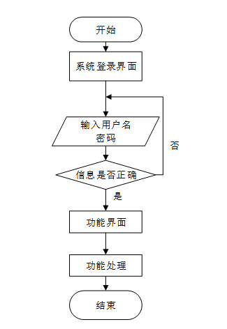 用户首先进入系统登录界面,输入用户名和密码后,系统验证信息是否正确。若验证失败,返回登录界面重新输入;若验证成功,则进入功能界面,执行相应功能处理后结束操作流程。操作流程如图3-5所示。