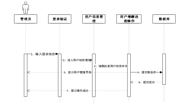 管理员输入登录信息后,进入用户信息管理模块,选择增删改查操作并提交命令至数据库。数据库执行操作后返回成功状态,系统显示用户管理界面并提示操作成功。管理员修改用户信息时序图如图4-5所示。