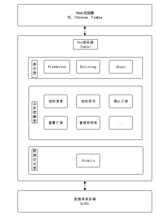 系统由表现层、业务逻辑层、数据访问层和数据库服务器组成。表现层通过浏览器(如IE、Chrome、Firefox)与用户交互,采用FreeMarker、Bootstrap、jQuery等技术实现界面呈现。业务逻辑层负责处理系统的核心业务逻辑,通过分模块设计实现功能分离。数据访问层使用MyBatis框架连接数据库,执行数据的增删改查操作。数据库服务器采用MySQL进行数据存储和管理,为系统提供稳定的数据库支持。整个架构通过Tomcat服务器完成用户请求的接收和处理,确保系统的高效运行[8]。整个系统架构如图4-1所示。