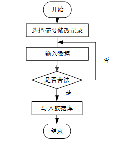 用户首先选择需要修改的记录,输入修改后的数据,系统判断输入数据是否合法。若数据不合法,提示重新输入;若数据合法,则将修改后的数据写入数据库,完成操作后流程结束。修改信息流程图如图3-7所示。