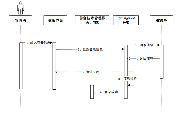 管理员输入登录信息后,登录界面将信息传递至前台管理界面,随后通过SpringBoot框架读取数据库中的用户信息并返回。系统验证信息,若验证成功则登录成功,若验证失败则返回错误提示。登录时序图如图4-4所示。