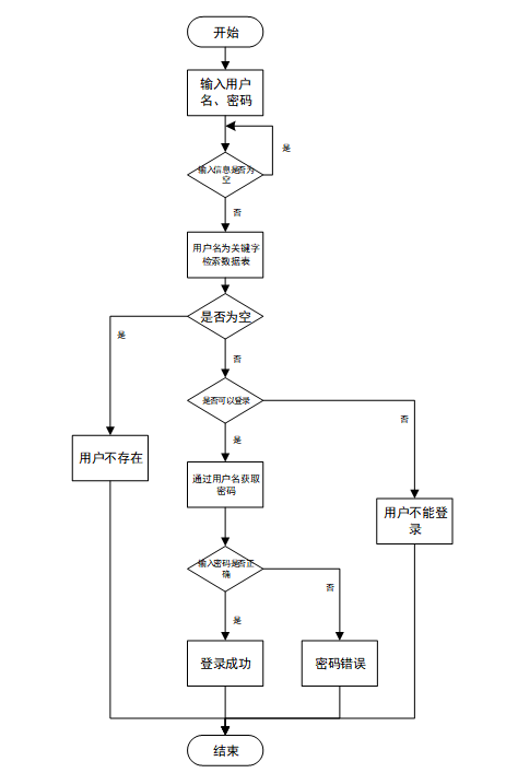 用户输入用户名和密码后,系统先检查输入是否为空,再验证用户名是否存在,若存在则通过用户名获取密码并校验。若密码正确则登录成功,否则提示密码错误。若用户名不存在或无法登录,提示用户操作无效。如图3-4所示。