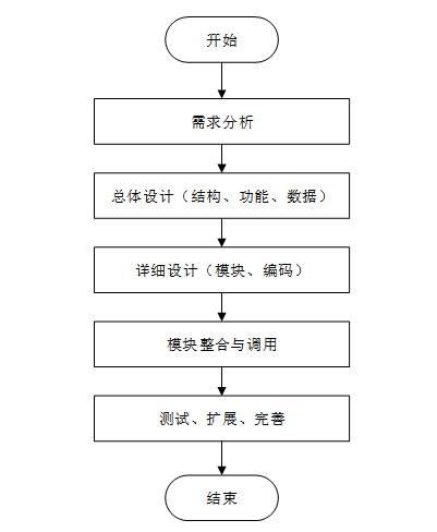 系统开发流程的主要步骤,从需求分析到系统完成的全过程。流程包括需求分析、总体设计(结构、功能、数据)、详细设计(模块、编码)、模块整合与调用,以及测试、扩展和完善,最终完成系统的开发。本系统的开发流程如图3-3所示