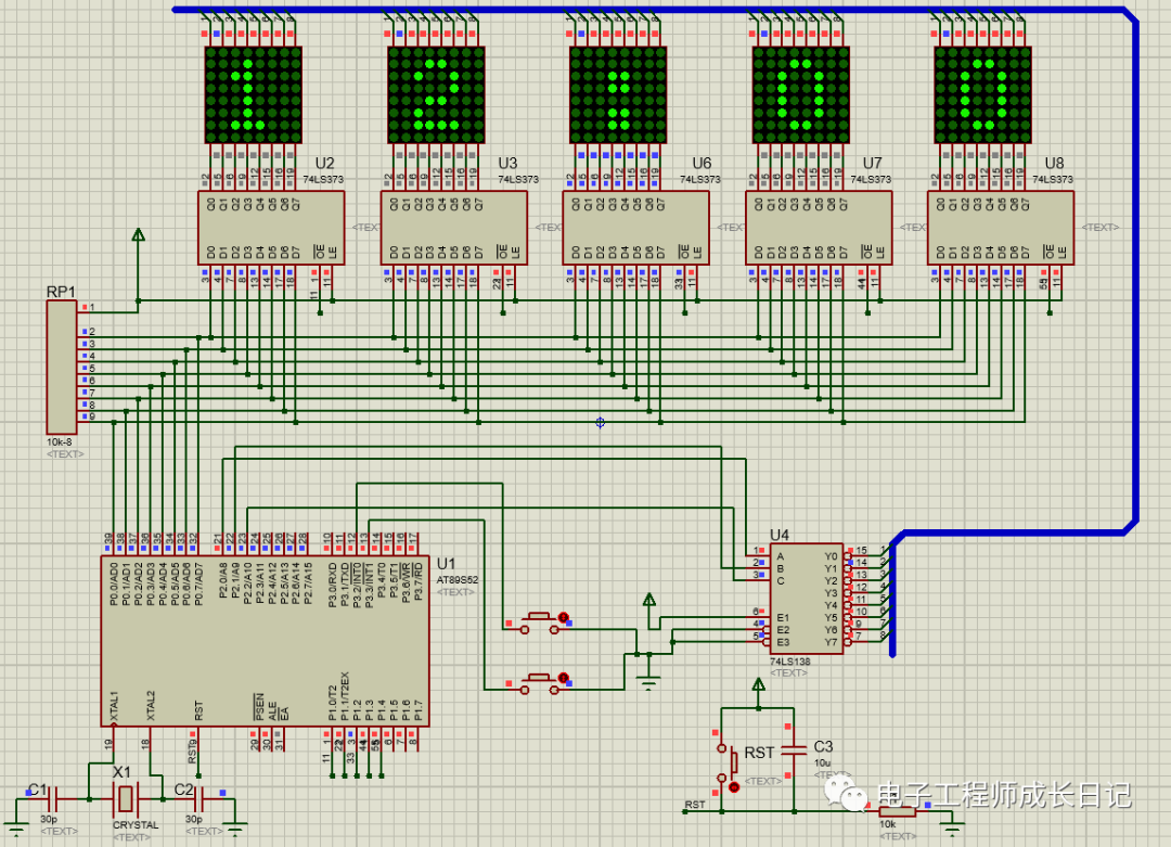 通过5个8*8led点阵显示数字时间,显示时分,从12点开始计时,显示时间格式为:12::00。