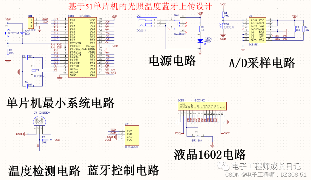 系统由STC89C52单片机电路+光照检测电路+DS18B20温度检测电路+蓝牙模块电路+LCD1602液晶显示电路+电源电路组成。