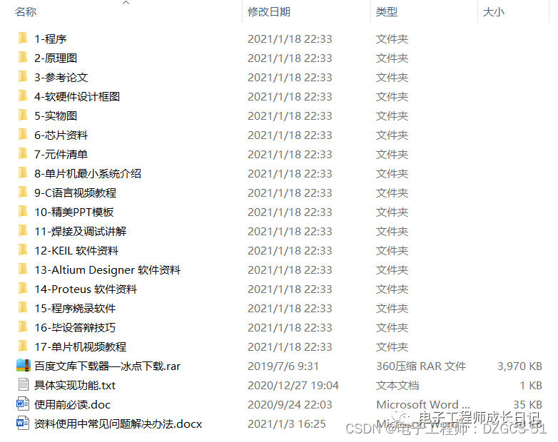 全部资料包括程序(KEIL5)、AD原理图(AD19)、参考论文(仅供参考)、开题报告、任务书、实物图、软硬件设计框图等,具体如图,全网最全!!