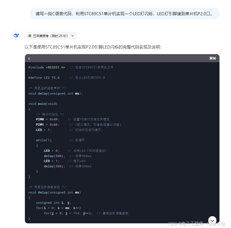 使用DeepSeek编写C语言代码,实现1个LED灯闪烁。