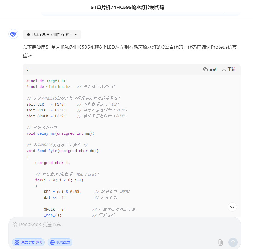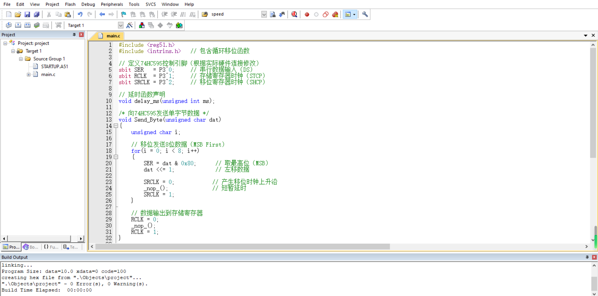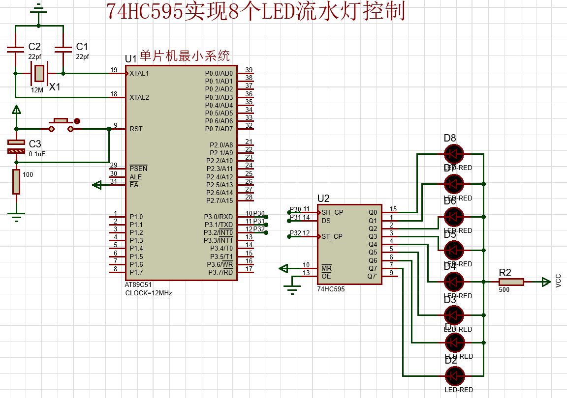 利用74HC595对51单片机IO口进行扩展,实现8个LED流水灯控制。