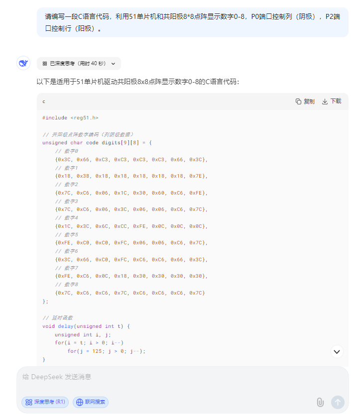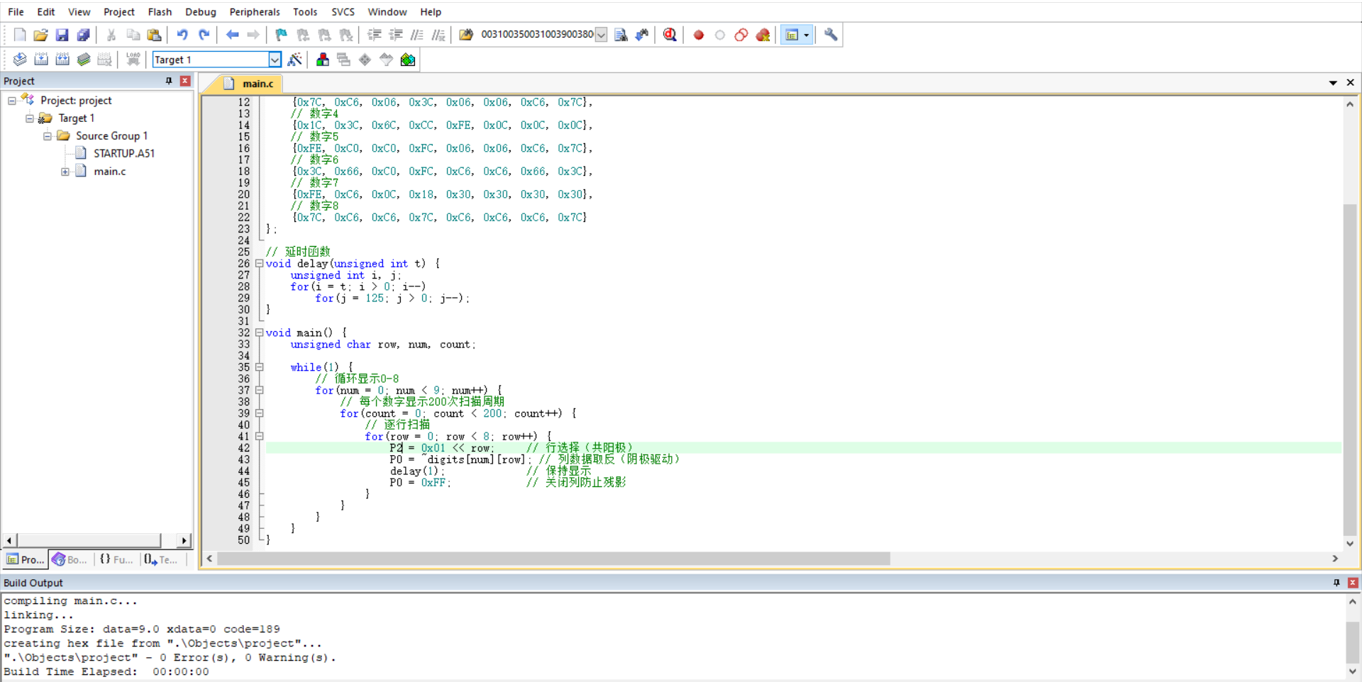 P0 = ~digits[num][row]; // 列数据取反(阴极驱动)