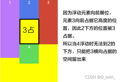 8.当元素浮动时虽然不自占一行,但会向前占位,前方空值的位置都会属于自己所有,因此后方的元素换行时,不能占据元素向前占位的地域(见元素占位示意图)