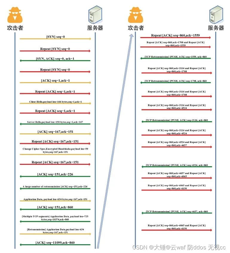 此攻击由Mirai僵尸网络的网络层CC攻击演进而来,即攻击端和服务器在通过Socket进行完整HTTPS数据交互的同时,通过Raw-socket将交互过程的SYN报文和ACK报文进行高速回放,对服务器形成泛洪攻击效果。