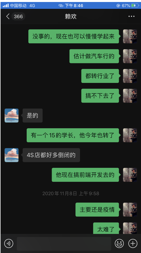 然后空闲的时候,我就向这些学长问一下待遇咋样;我清楚的记得当时一个学长和我实习期一个月1000块(当时我是在赣州那边,因为我大专是在赣州读的),而且还不吃住的那种哦,转正也才1500;你看到这里,你会脱口而出:卧槽!才这么点钱,这怎么活啊,但是事实就是这样,赣州消费水平也不低,平时吃个饭也怎么要十来块;还有后来我在学校准备专升本(hh,说到这个我自己也不咋后悔没有考上,有得就失,鱼和熊掌不可兼得!),听我的同学以及同学院的朋友出去去其他城市分享的待遇情况,比我刚才好不了多少,工资大概也就三千最多,如果是做汽车销售,按提成来拿的话,工资可能就会更高一点。你说这么点工资在现在这个社会怎么活,更别说有存钱的说法了,连养活自己都很难。所以在我毕业一年了,我平时也会和一些以前同学和朋友聊到他们现在在干啥: