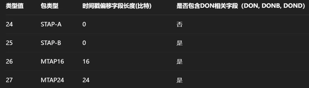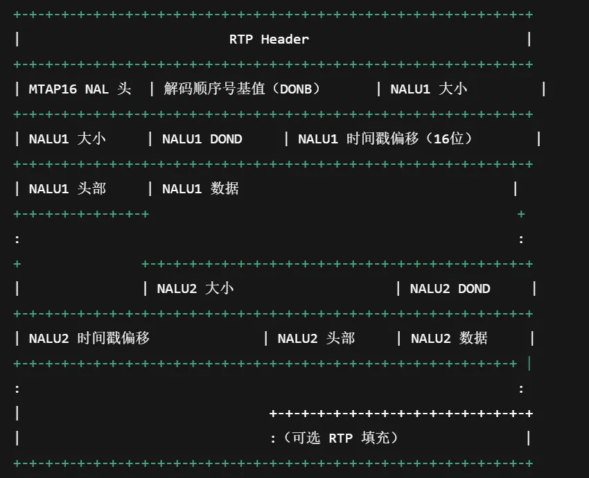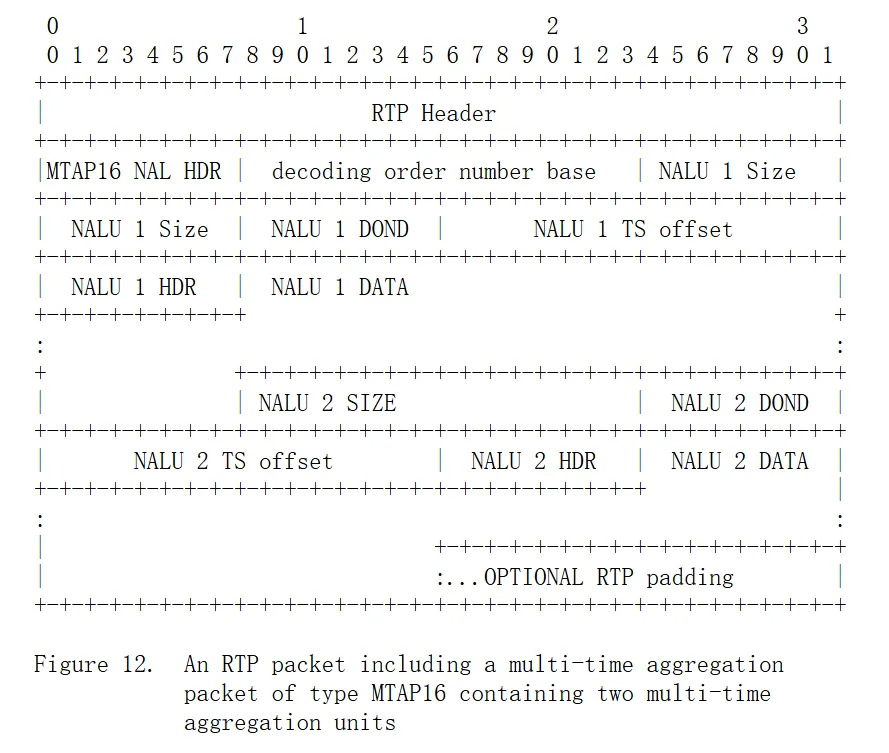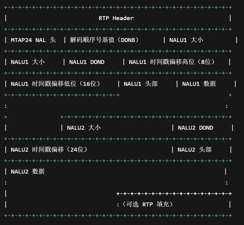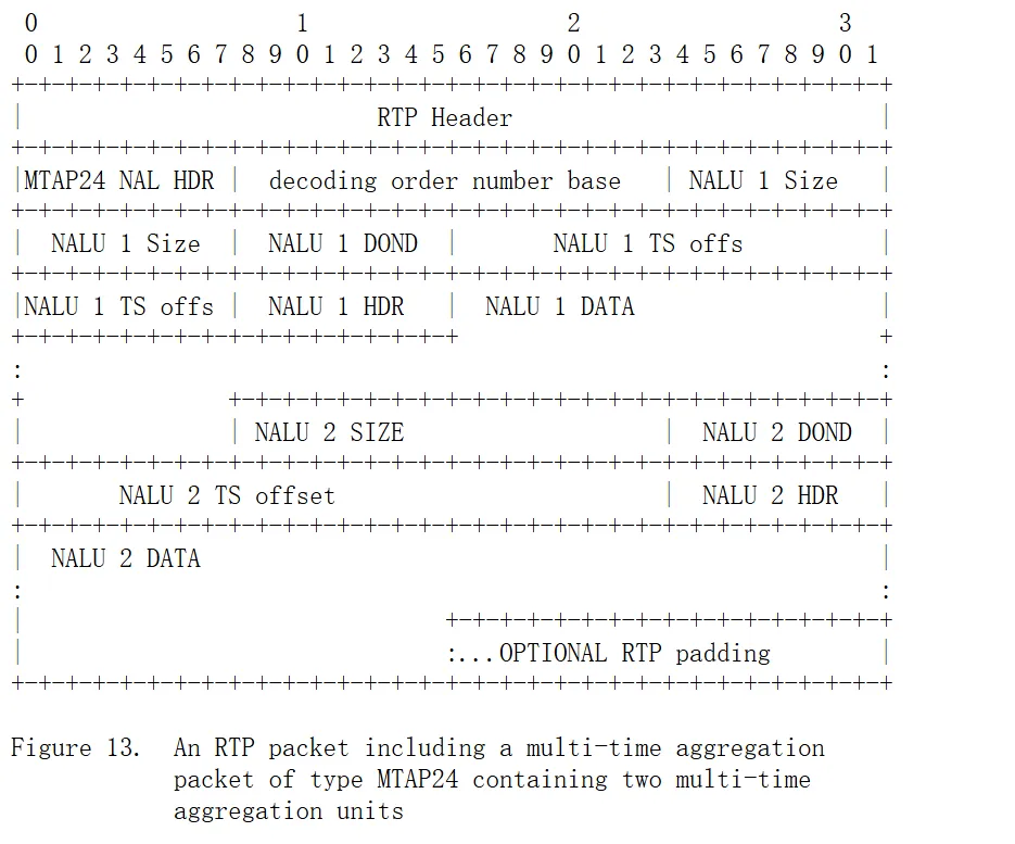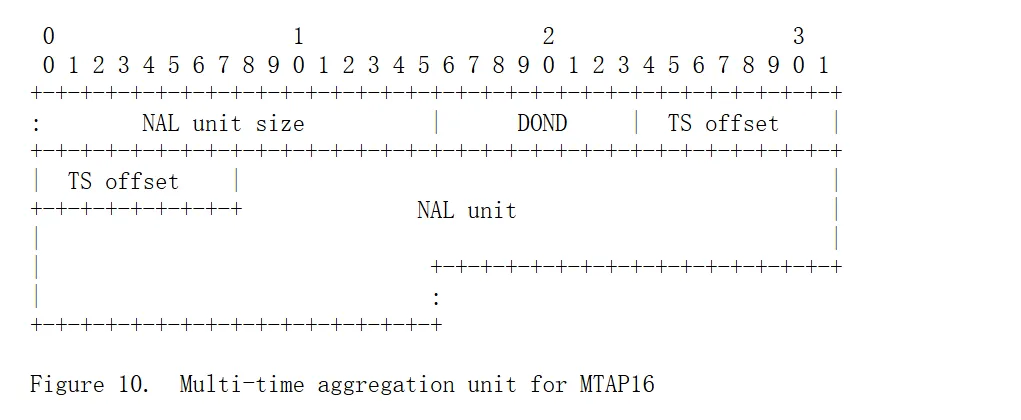 对于 MTAP 中最早的多时间聚合单元,其时间戳偏移值必须为 0,因此 MTAP 自身的 RTP 时间戳与最早的 NALU 时间相同。