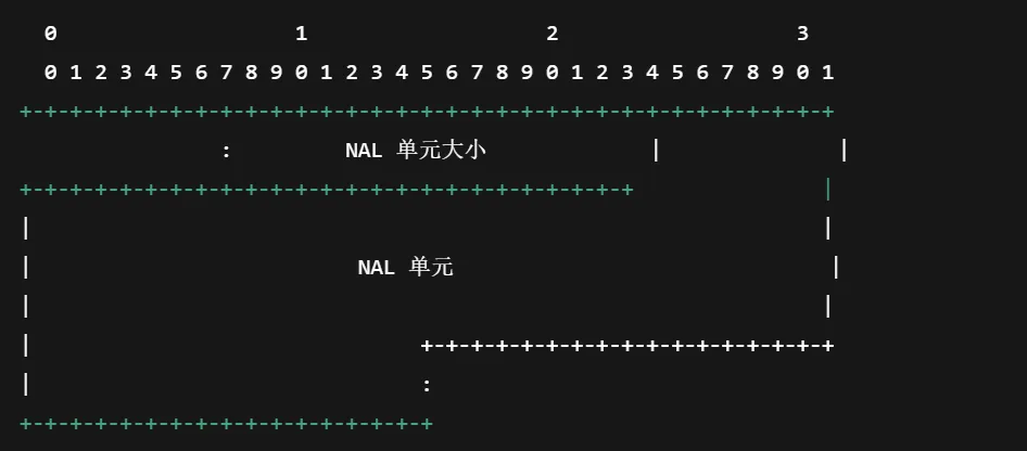 ● 一个 16 位无符号整数,表示后续 NAL 单元的大小(不包括这两个字节,但包括 NAL 单元类型字节),采用网络字节序;